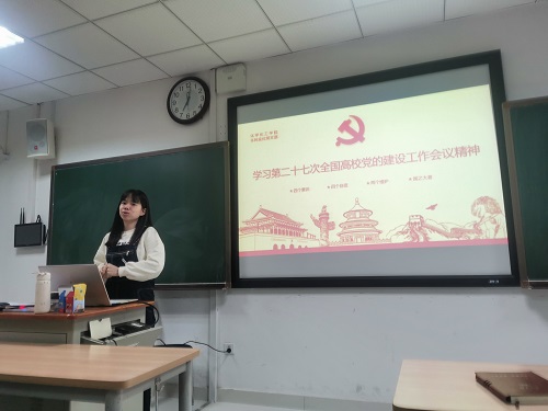 2021年10月20日,湖南大学本科应化党支部于研究生院楼A202教室开展了对第27次全国党的建设工作会议精神的学习。由吴苑菲同志主讲,支部全体成员到课学习。