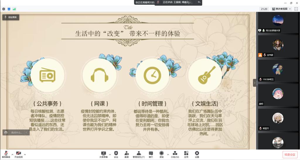 会议首先,团支书介绍了班会主题和会人员,并谈到本次园区隔离期间进行的网课与2020年在家隔离时的线上教学活动给了人们不一样的体验。在随后的交流讨论环节中,王景毅与肖镒林同学对网课亲身体验和隔离期间的难忘事件发表了自己的看法。王景毅同学谈到,在抢庄牛牛官方网站