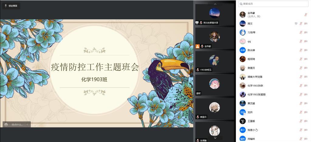 化学1903班于2022年4月17日晚上19时借助腾讯会议线上平台举行了“疫情防控工作”主题班会,本次班会邀请到了原化学类1903班班主任刘强老师参会,由团支书周文主持,化学1903班共26名同学参加,2人请假。