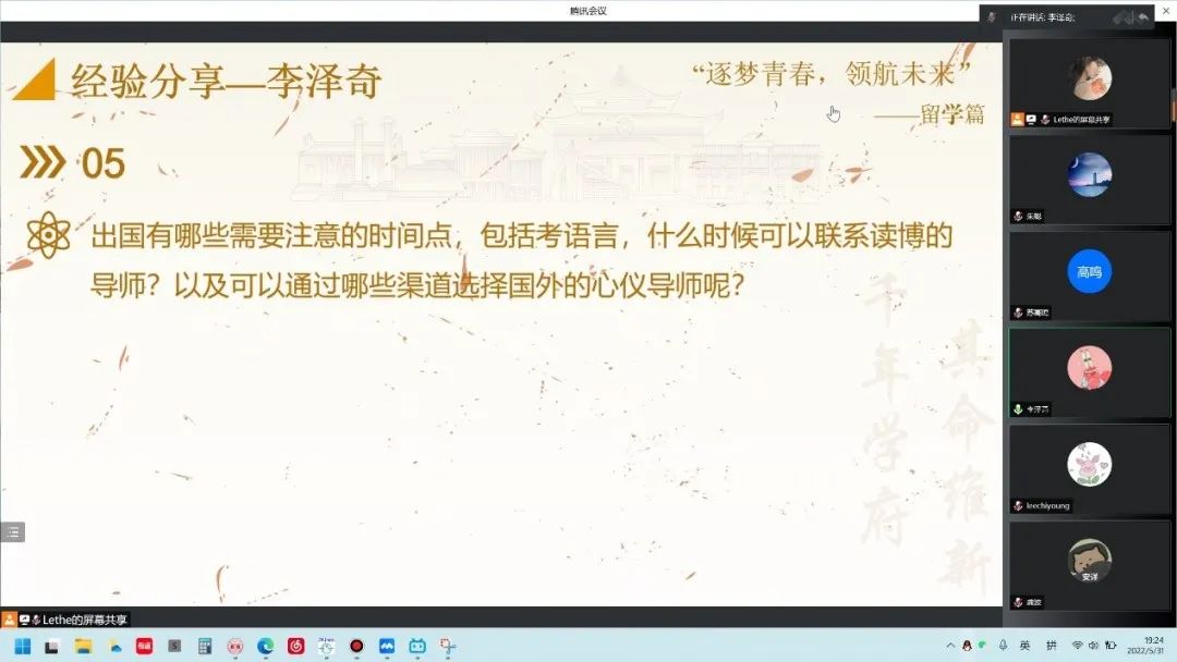 的申请途径、疫情之下留学申请的难点等心路历程。他向大家表明自己出国想法的由来,并针对留学申请阶段了解到的一些信息分类阐述留学需要关注的点,最后为有意向留学的师弟师妹提出建议。