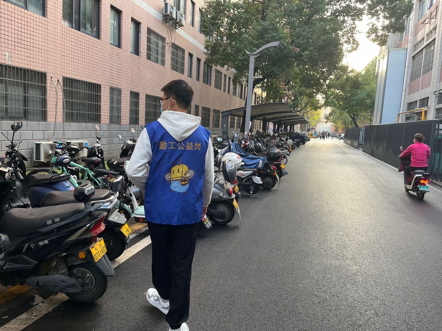 纵然长沙的气温变化大;纵然需要同学早起;纵然有疫情影响,志愿者们依然保持热情,戴着口罩依然可以感受到他们的笑容。在活动中,志愿者对忘记戴头盔的同学进行提醒,并对不理解的同学细心讲解。对于一些“堵车”的同学,志愿者们也会帮忙挪车,解救他们于尴尬与无奈之中。当然,志愿者们也会将电动车和自行车进行规范摆放,让园区看起来更美观。同学们也是十分配合,积极戴头盔出行。抵触戴头盔的同学见到热心的志愿者,更是十分惭愧,默默的戴上头盔。志愿者们游走在宿舍园区的各个地区,全面、认真的完成任务,为确保同学的骑行安全积极贡献自己的一份力量。
