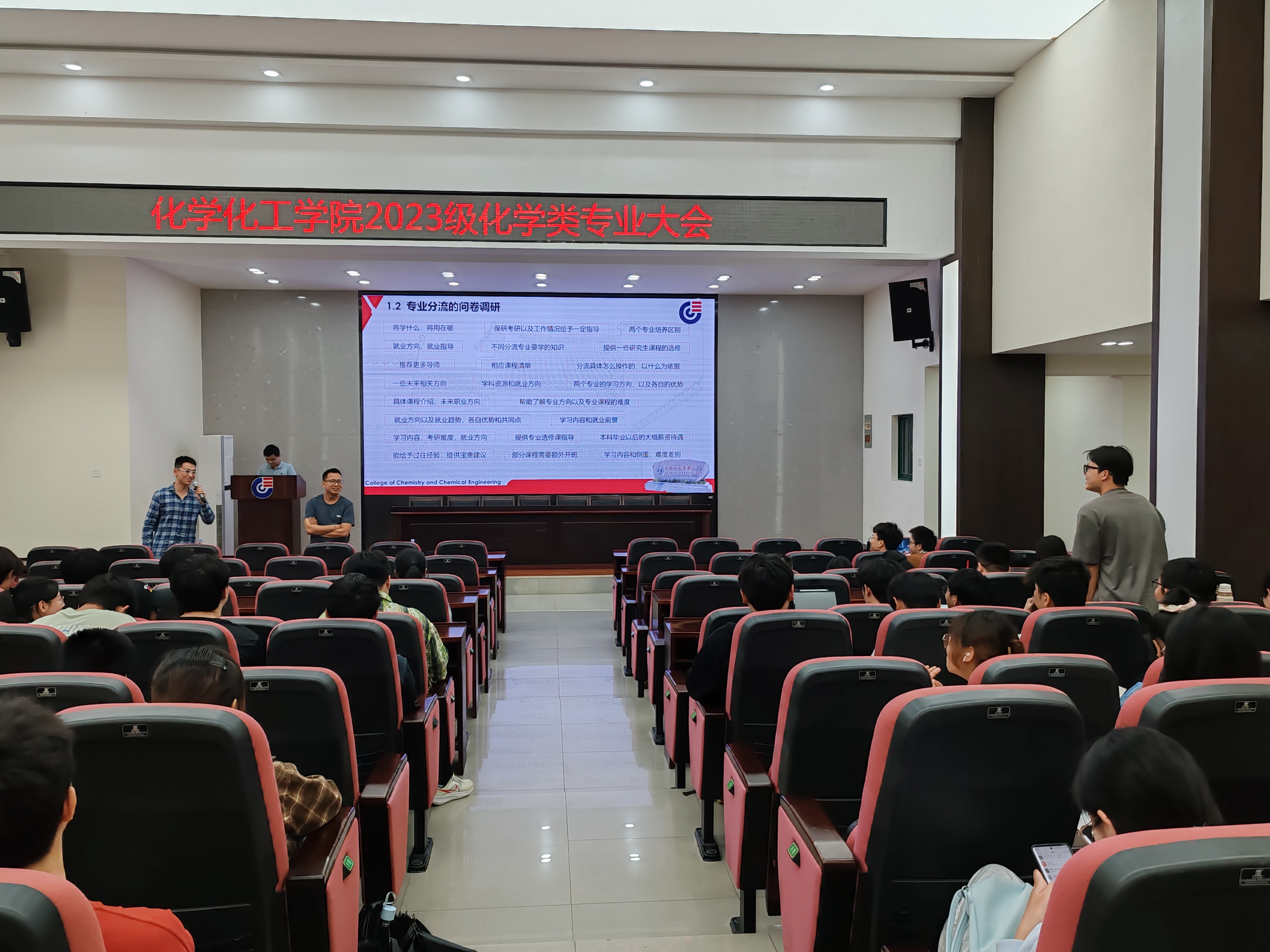 作为会议重点,专业分流板块通过前期问卷调研收集学生意向,并邀请两位系主任进行权威解读。化学系主任吴英鹏教授系统介绍了化学专业的学科特色、课程体系及科研方向,强调“夯实基础、探索前沿”的培养理念;应用化学系朱建教授则从应用导向出发,解析了专业在金属腐蚀与防护、二维材料、新能源等领域的优势。现场互动环节环节,同学们们围绕课程设置、就业前景、科研方向踊跃提问,两位教授逐一解答,为学生的个性化选择提供参考。