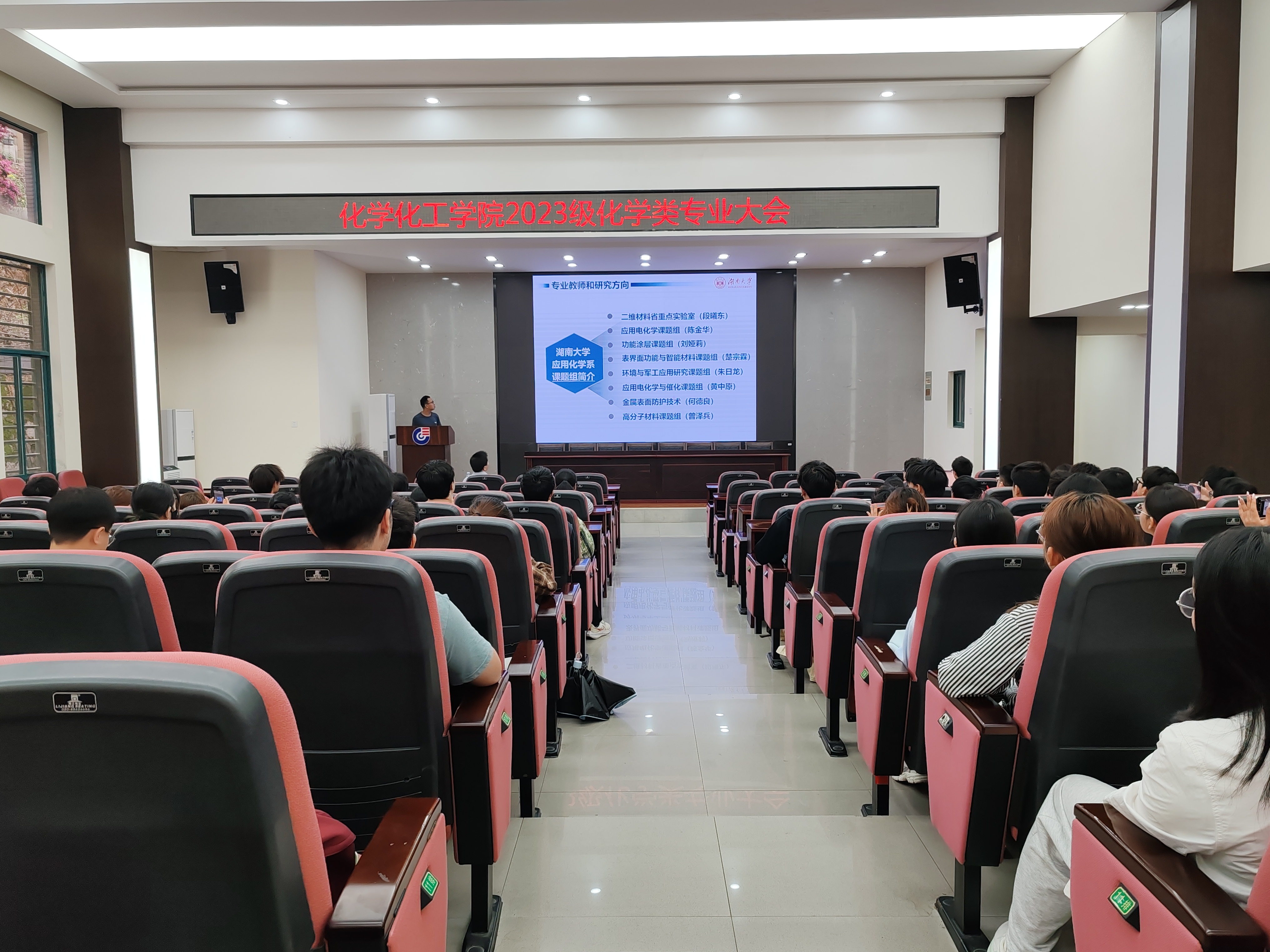 2023级化学类专业学生大会在新化工楼D区报告厅举行。会议由辅导员南彬主持,围绕专业分流指导、学业成绩分析、安全教育强化、日常管理规范四大主题展开,旨在帮助大二学生明确学业方向、筑牢安全防线、提升自我管理能力。邀请化学系主任吴英鹏教授、应用化学系主任朱建教授进行分享,全体2023级化学类本科生参会。