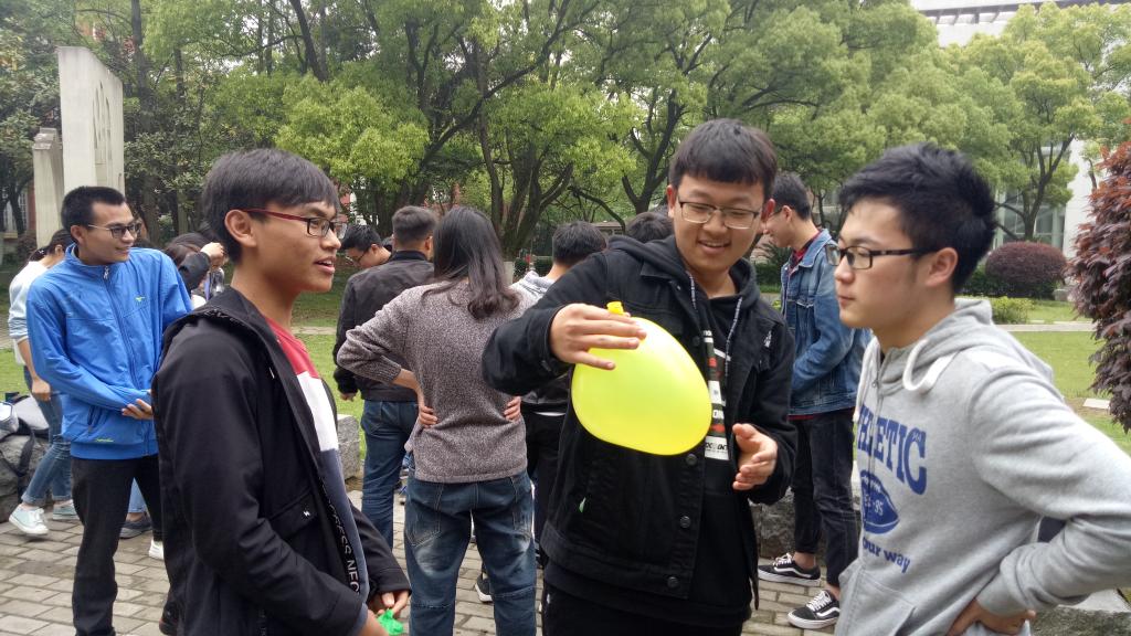 首先,李帅同学将班级的所有同学分为了四组,每组两个女生四个男生,分完组之后便开始了游戏环节。第一个游戏“六人一体”,每组六个人中每人只能使用身上的一个部位完成吹气球和坐爆气球的任务。这看似简单的任务真正完成起来也让同学们手忙脚乱,有的组将气球吹飞了,有的组没有办法控制好气球的位置。但经过几次失败之后,各组都基本掌握了游戏方法,并有了明确的分工,游戏也进行的很顺利。第一轮游戏结束后,梁婷同学笑着说:“原来每个人出一份力也不一定能把事情做好,在这个基础上还要有默契的配合才行啊。”