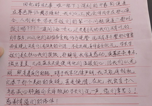 这一周时间里,班助们细心周到的照顾也使同学们感受到了化工院大家庭的温暖——“今天早上第一次因为不舒服休息了一会儿,他们温柔体贴的样子与整队训话时判若两人。”、“每天学长学姐们见我们说的第一句话都是问我们吃饭了吗。他们无时无刻不在关注我们,真的很感动。”