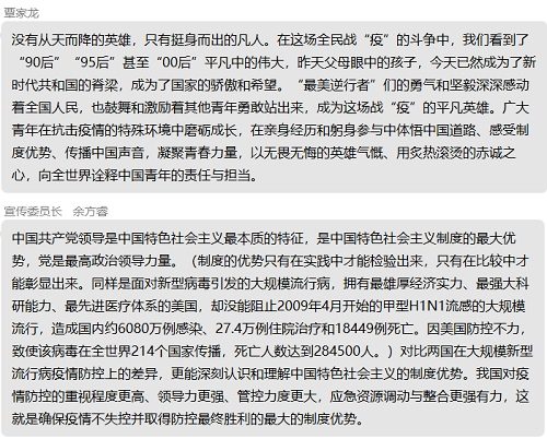 会议的第三项同学们围绕教育系统抗击疫情的担当作为、阐述中国特色社会主义制度优势、弘扬新时代爱国主义精神、提升科学素养和人文情怀、坚定爱国力行的使命责任等内容,开展讨论交流。