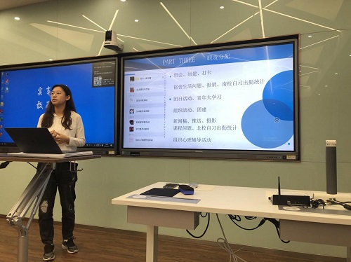 第三部分为职责分配,提高效率。班长由日常中出现的问题出发,例如有同学对于各班委的职责任务不明确,多方撒网,使得多个班委同时处理一件事情,因此在班会上再次明确了各班委的职责。班长主要负责各类班会、团建以及一些相关通知的转达;团支书负责准备团日活动、督促青年大学习以及团支书群里通知的转达;学习委员督促大家学习,监督大家联系导师,与导师互动,督促同学上自习,记录请假、出勤,并负责北校的同学自习请假,同时负责解决关于选课、补修、退选等课程问题。班会结束后紧接着召开了一个简短的班委会。