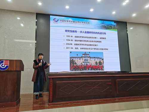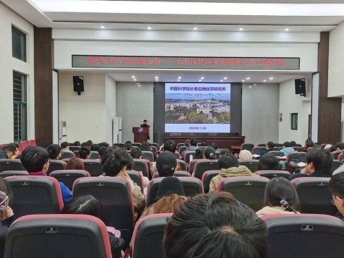 的历史讲起,它历经七十载发展成为现在聚焦“化学”与“材料化学”的先进研究机构,包括“先进材料与制造”、“生态与环境”、“人口健康”三大领域,12个研究方向。其次,老师介绍了应化所研究生教育发展历程,它是理学化学一级学科及5个二级学科齐全的培养单位,步入全国研究机构先进行列,并进行了丰硕的研究成果展示。最后是招生简章,老师通过对应化研究所的奖学金金额、毕业去向、教学实力、科研平台、业余生活等多方面进行介绍,向18级同学抛出了橄榄枝。