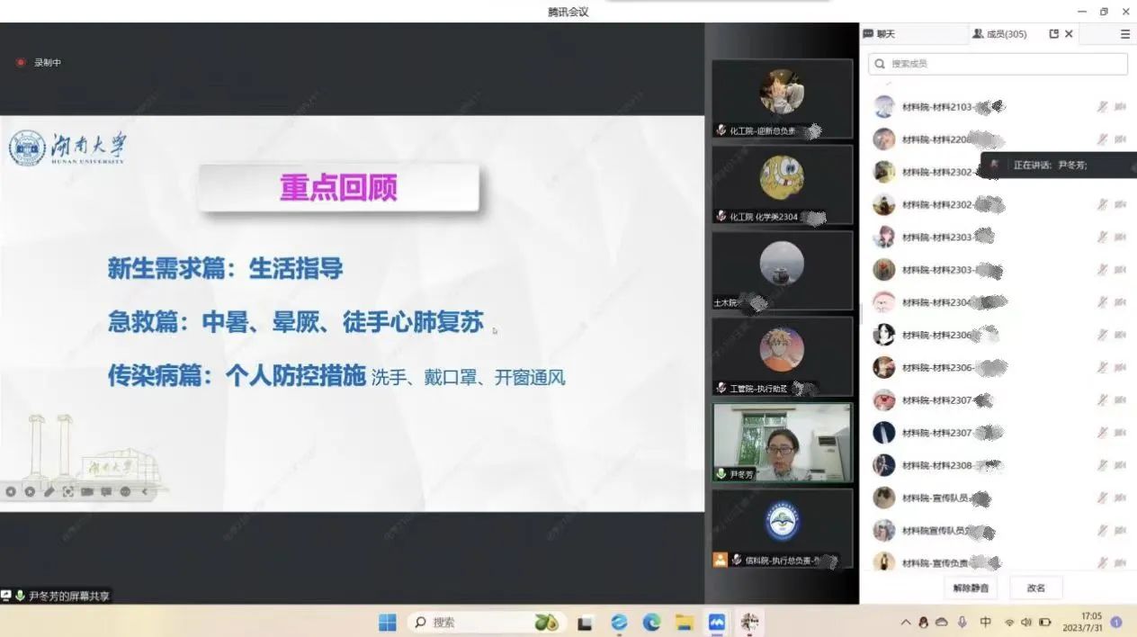 2023级新生助理应急救护培训,属于医疗知识培训,通过腾讯会议举行。本次培训由湖南大学医院尹冬芳老师主讲,尹老师从新生需求、急救、传染病这三方面展开讲解、培训。