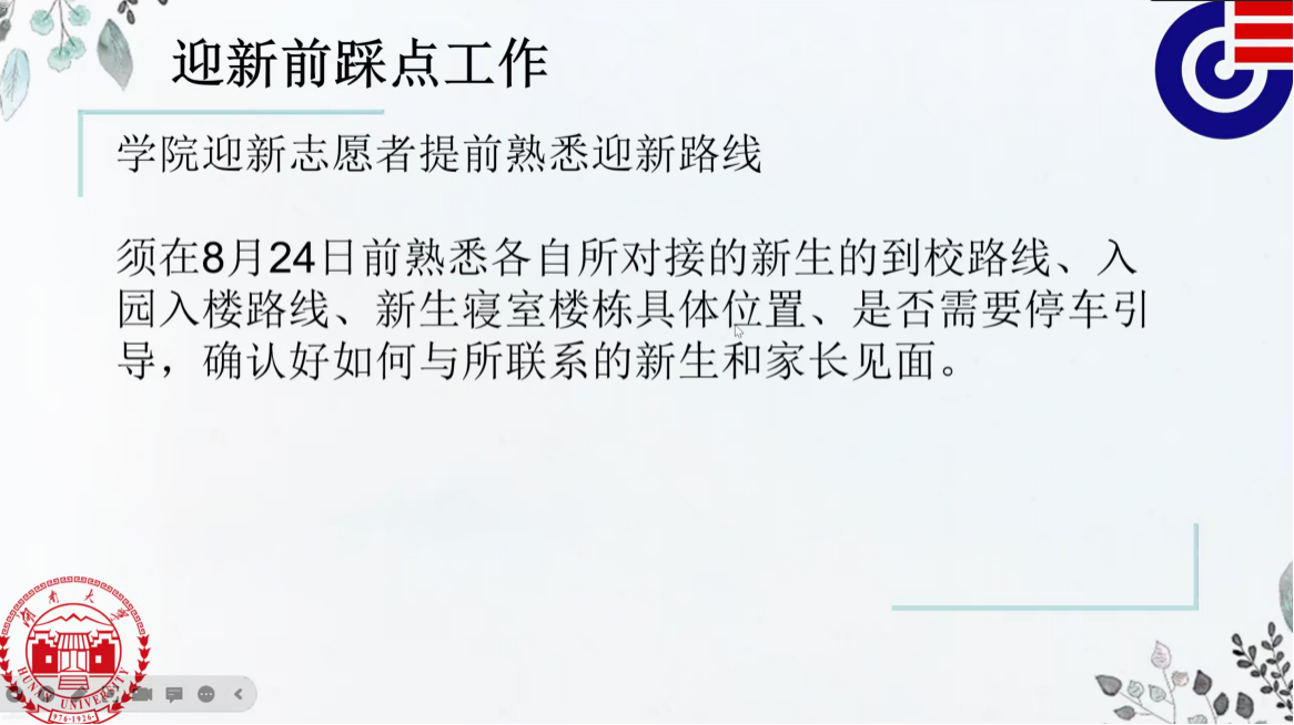 通过腾讯会议开展了新生志愿者线上培训会,旨在让迎新志愿者明确提前的踩点工作及迎新当天的工作安排。本次会议由化工院青志协部长、2023级迎新团队志愿者负责人胡梁榆同学主持。