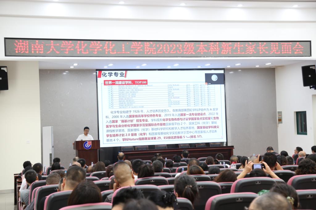 院长张晓兵教授、院党委书记王双印教授、副院长梁志武教授、副院长李永军教授、副院长陈四海老师、化学生物传感与计量学国家重点实验室副主任羊小海教授、化学生物传感与计量学国家重点实验室副主任刘松教授、院长助理罗潇教授、化学系主任吴英鹏教授、化工系主任王少飞教授、应用化学系主任朱建教授、化学生物学与分子医学系主任刘剑波教授、2023级新生班主任、院学工办主任刘卓老师、全体辅导员老师,200余名2023级新生家长参会。