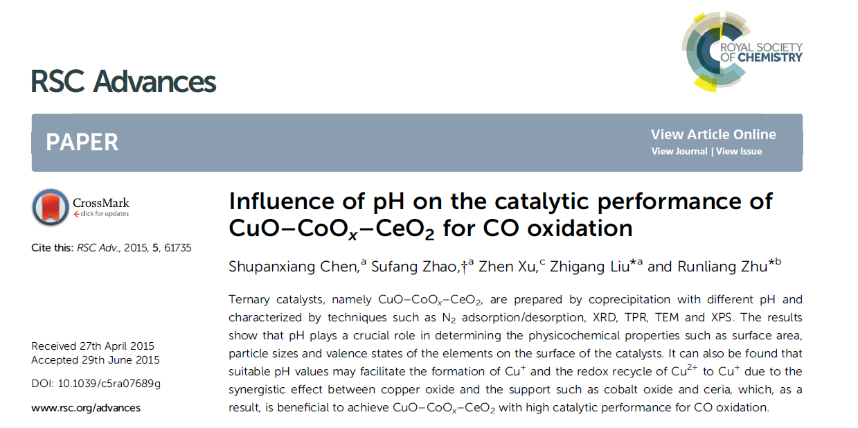 2011级本科生陈书攀祥和董旭龙同学在英国皇家协会出版的RSC Advance杂志上发表了学位论文三篇;其中陈书攀祥同学更以第一作者的身份发表了题为“Influence of pH on the catalytic performance of CuO–CoOx–CeO2 for CO oxidation”的学术论文。