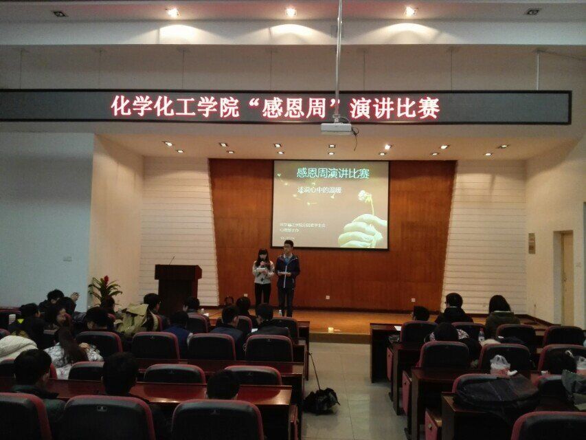 于2015年12月24日中午12:30在化工院报告厅举办了“感恩周”演讲比赛,让同学们尽情抒发自己对老师的感恩之情。在本次比赛中担任评委的有党委副书记陈义红老师,12级辅导员陈晓晖老师,13级辅导员曾芷兰老师,14级辅导员刘世明老师,15级辅导员刘卓老师,学生会主席李兴洲同学。