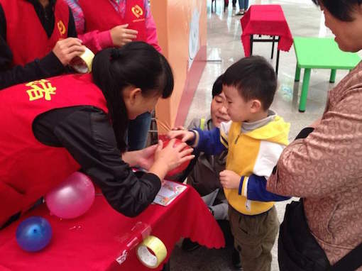 志愿者分为7组,每天早上7点20准时在天马公寓门口集合,经过约一小时的车程,8点40在科技馆负责人组织分工下开始热情地投入一天的工作。有的志愿者扮成玩偶负责在入口处欢迎小朋友,有的在展台负责为小朋友讲解,如“牛奶和洗洁精的神奇反应”“这只气球会爆炸吗”“瓶中彩虹”等科学现象的原理,还有志愿者负责帮助小朋友制作“有线电话”“飞去来器”等。
