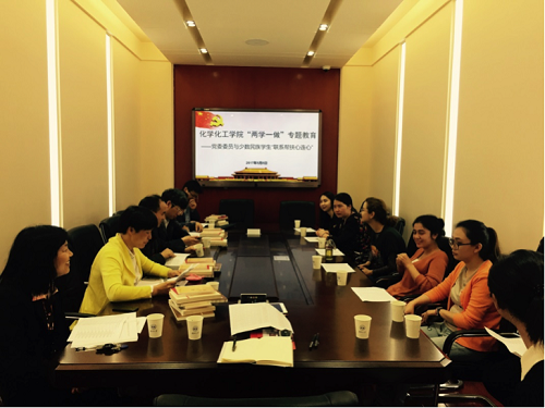 新疆、西藏籍少数民族学生在一舍123会议室开展“‘两学一做’专题教育活动——党委委员与少数民族学生联系帮扶心连心”座谈会。座谈会由陈义红委员主持,8名少数民族同学参加。