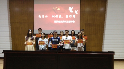 挂牌活动介绍完毕后,大会进行了预备党员转正答辩活动,戴娇等9位预备党员进行了转正答辩。预备党员们从预备考察期的的思想状态,学习生活和工作开展着手,分别介绍了在预备期内思想觉悟和理论基础的提升,在自我约束规范和学习方面的进步,同志们对自我进行了深刻的剖析和反思,指出了自我的缺点和不足之处,并提出了改进的措施。党支部书记刘世明同志针对同学的答辩过程,结合时事政治,从核心价值观和习近平书记“五四讲话”的精神等方面提问,和答辩同志们探讨电视剧《人民的名义》中故事,见微知著,从细节处考察答辩人的思想觉悟。