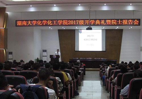 伴随着庄严肃穆的国歌声,典礼正式开始。接下来就是由院党委书记王玉枝教授致欢迎辞,她首先对考入湖大化工院的17级新生们表达了衷心祝贺和热烈欢迎。不仅如此,王书记还在欢迎辞中提出了几点建议并希望与同学们共勉。最后王书记用韩愈的一句话“业精于勤,荒于嬉;行成于思,毁于随”激励同学们在大学四年里努力学习,奋发向上,在化工院书写自己的璀璨人生。