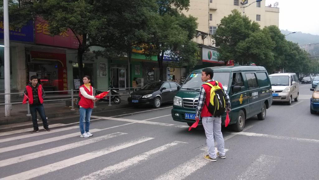 12级同学负责的交通协管工作圆满完成并成功传递到化工院13级同学手中。本次交通协管任务由12级年级会组织,工作被分配到全年级九个班中,具体由各班班委负责。每一天的交通协管工作分为早上7:30到8;00,中午11:30到120:0和下午2:00到2:30与5:30到6:00,总共四个时间段。这四个时间段也是人流量与车辆量最大的时间段。这就使得交通协管工作在最适当的时间保障了同学们过马路的安全与行车的通畅。