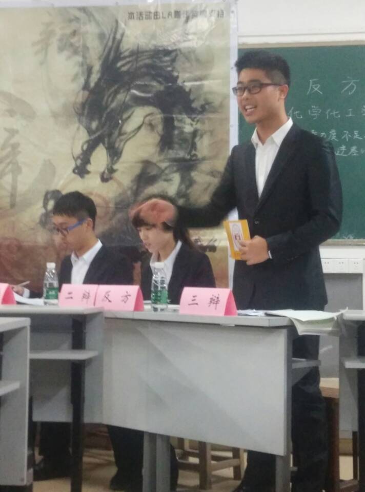 三辩是化工院的辩论队领队吴天忍,经验丰富的他舍弃原有的一辩位,初次大胆尝试三辩的位置,用幽默的举例向我们传达了政府的强制性不能真正解决文化认同的问题。