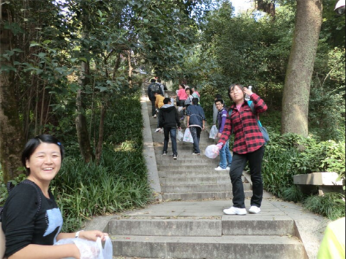 周四上午阳光明媚,虽然天气稍有些冷,但伙伴们登山的热情不减,情绪高昂。此次活动中大家本着绿色环保出行的原则,22个人先在岳麓山南门集合,然后从山脚下开始进行清洁,所过之处不留一片垃圾,大家也受到了登山运动者的表扬和赞许,感觉心里美滋滋的,干起活儿来也都更卖力了。一个多小时的清洁工作过去后,考虑到队伍中还有体力较弱的女生,我们在山上选了一块平地先吃了点食物稍作休息,片刻过后便继续进行我们的工作。整个过程中,大家人手一个装垃圾的袋子,逐渐装满了沿途走来所见的各色垃圾,吸引了沿途路人们的目光。大家也希望能通过这样的活动让路人们意识到保护环境人人有责,可以养成良好的生活习惯。历经两个半小时,大家也登上了山顶。在山顶休息了一会儿,同学们把垃圾都装进了自己书包全部带下山去,在下山的过程中发现还是有人乱扔垃圾,不过经过积极的劝导和教育后,丢垃圾的人也都认识到错误并且改正,这让大家倍感欣慰。
