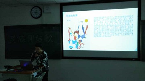 而本次活动中,给大家印象最深的莫过于来自广西壮族自治区的壮族同学韦林婧。她从壮族的地理分布和人口比重入手,依次为大家讲解了壮族精美别致的壮布和壮锦。同学们也感受到随着经济的发展,社会的进步,壮族文化也有了更多更广的发展生机。眼下火遍全国的“蓝瘦香菇”其实便是广西特有的“夹壮”现象。在大家的强烈要求下,同样来自广西的张凇玮同学为大家表演了“蓝瘦香菇”,博得了现场的一致好评,将现场的气氛推向了高潮。