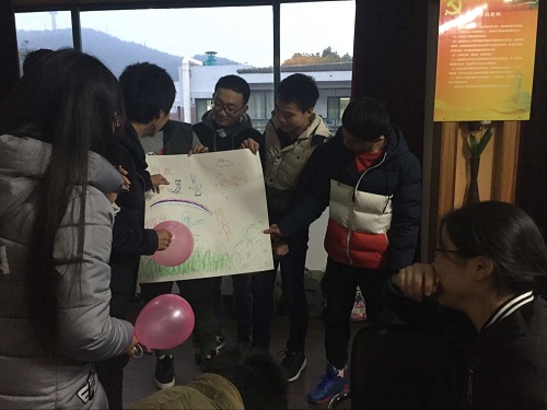 简单的热身游戏之后,陈晓晖老师拿出了一袋气球,还让同学们每人选一个是自己喜欢的颜色的气球。之后老师根据每人所选气球的颜色,将班上同学分成了四组,并要求各组在十分钟内共同确定小组的名称、组旗和小组的口号。各小组的成员们齐心协力,集思广益,最终也都在规定的时间内完成了任务。第一组在组长杨宇同学的带领下,每个人都在纸上画出了自己眼中的自己,其中喜欢篮球的李高骑同学在纸上画出了自己在灌篮的样子。第二组同学的队名为“梦之队”,队旗是海边日出的场景,他们还有一句响亮的口号是“梦之队,扬帆起航”。第三组同学则是运用了热气球这个元素,寓示着同学们可以像热气球一样越飞越高。第四组同学更是不同,受到气球颜色的启发,他们画出了一个中国版的小黄人。在作画的过程中,同学们彼此协作,在积极的讨论中撞出了火花,爽朗的笑声响彻整个会厅。