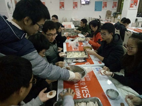 食堂的设施;准备以亲手包饺子的形式来迎接圣诞节到的到来。其中共有韭菜鸡蛋,白菜猪肉及藕片猪肉等陷料。同学们自发分组,围在馅料旁开始了包饺子活动。这其中有高手同学,包出了标准的模范水饺;还有初试包饺子的同学包出了奇形水饺。而最终饺子形状更是多样。有正常型,三角型,人形,太阳型,包子型,甚至还有各种馅料包在一起的“饺王”水饺。