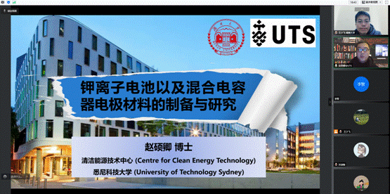 澳大利亚悉尼科技大学赵硕卿博士作了题为《钾离子电池以及混合电容器电极材料的制备与研究》的学术报告,主要研究方向为新一代具有高能量密度层状富锂基正极材料,新型钾离子电池电极材料和电解液。