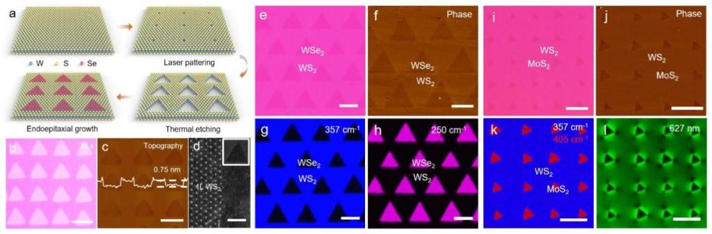 有鉴于此,段曦东教授(通讯作者)课题组报告了一种激光加工、各向异性热刻蚀联合精准外延的通用制造策略,制备了具有原子级锐利界面的2D过渡金属硫族化合物(TMDs)面内异质结阵列。在传统的光刻和加工工艺中,界面吸附以及污染物残留问题会导致外延过程中不可控的随机成核。通过发展全新的激光加工工艺和各向异性热刻蚀工艺,有力克服了上述难题,获得了原子级清洁的边缘界面,可作为另一种TMDs晶体的优先生长前沿,再利用反向气流外延合成技术,精准控制生长源的释放,实现其在原2D晶体的边缘精准横向成核与外延,可控制备了2D TMDs横向异质阵列。该加工方式展现了高度稳定和可调的原子级加工精度,此外,通过精确控制激光加工位点、热刻蚀加工温度和时间,2D TMDs横向异质阵列的形态与图案可以得到完美控制。系统的微观结构和光谱特征揭示了二维镶嵌异质结构中化学成分、晶格应变和电子带隙的高度精细的周期性调制(图1)。同时,高分辨球差透射电子显微镜证明了镶嵌异质结构中的原子尖锐和清洁的界面。