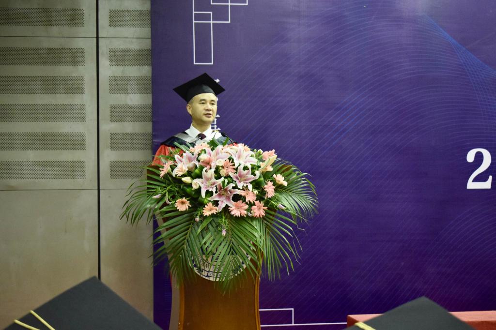 学位授予仪式在雄壮的国歌声中拉开序幕。在热烈的掌声中,院长张晓兵教授以题为“逐梦新征程,奋进向未来”致辞。他首先向2022届毕业生圆满完成学业表示热烈祝贺,回顾了毕业生在校期间取得的优秀成绩。他从三个方面对全体毕业生提出了殷切希望:一是希望同学们要有碧血丹心的家国情怀;二是希望同学们要有经世致用的干事本领;三是希望同学们要有天下大同的远大格局。他号召同学们要从人类前途命运的维度出发,以发展的眼光投身科学研究,矢志造福人类。最后,他深情地嘱托同学们在努力拼搏的同时照顾好自己,母院和老师们将永远关注和守望着毕业生们的发展,欢迎他们常回家看看!