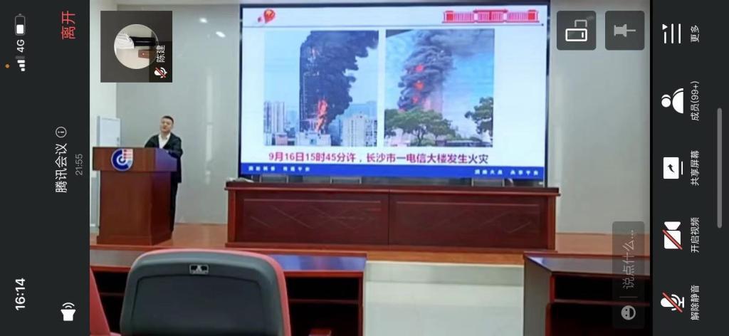 消防安全教育讲座。本次讲座由消防公益服务中心的李教官主讲,全体教职工线下、研究生线上参与本次讲座。