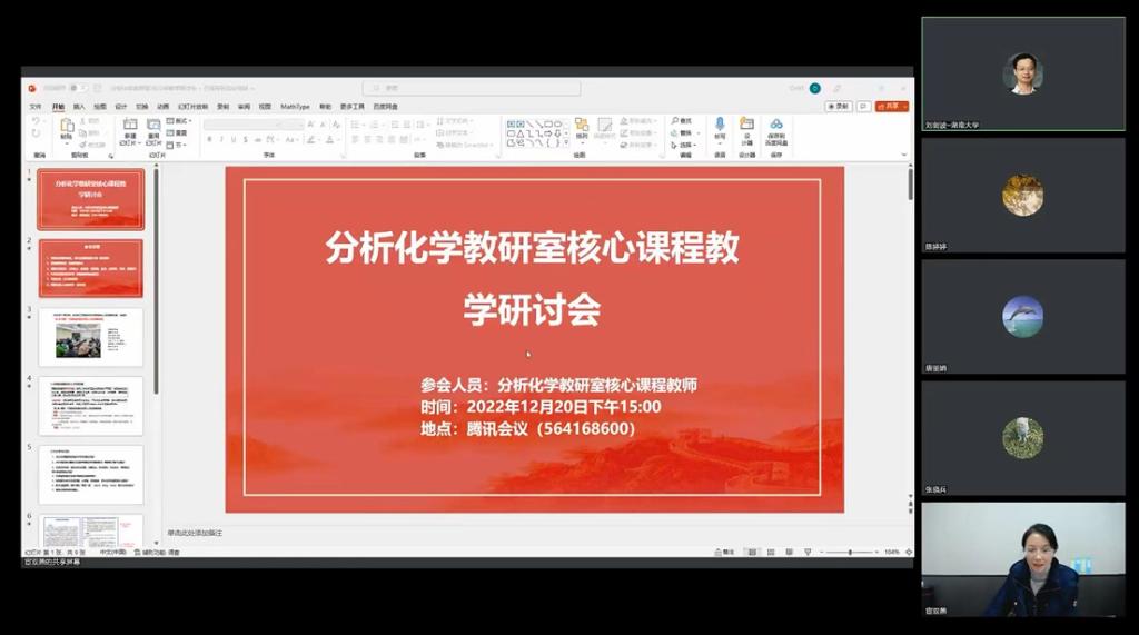 召开的 “院-系-课程” 三级联动构建全链条人才培养新格局会议精神,2022年12月20日下午,分析化学教研室采取腾讯会议线上模式召开核心课程教学研讨会,针对分析化学系列课程及实验教学中存在的问题,充分研讨如何从教学过程中各个部分严格管理,来有效提高本科教学质量,落实立德树人根本任务。研讨会由分析化学课程负责人宦双燕老师主持。担任分析化学(1)、(2)、波谱分析和分析化学实验等相关课程教学的31位教师参会。