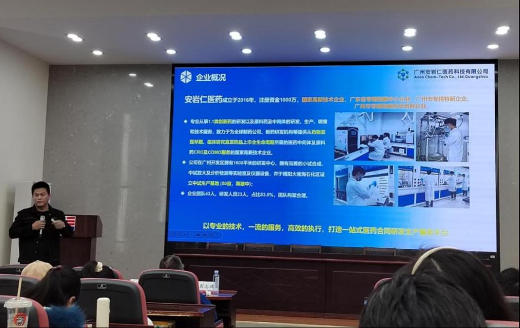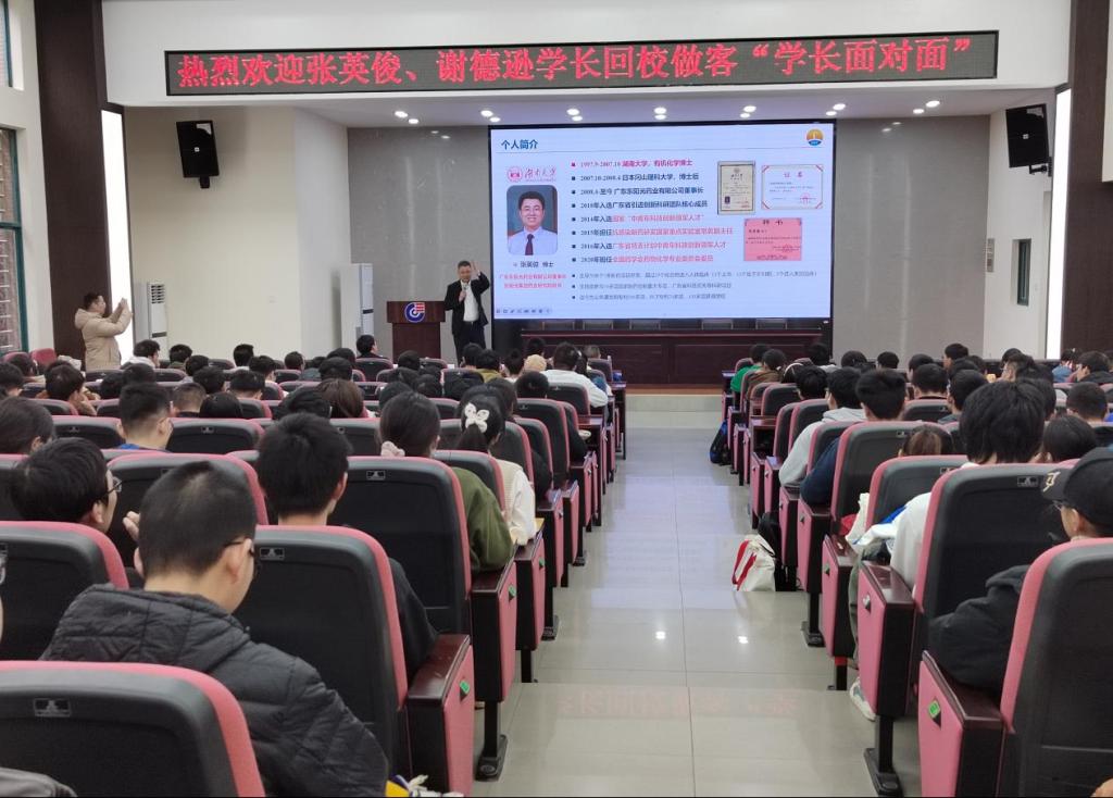 活动伊始,张英俊学长向同学们分享了自己在湖南大学和日本静冈理工科大学的求学经历,介绍了创新药物研发的意义、药物研发的过程以及广东东阳光药业的部分药物研究成果,并鼓励同学们勇于担当,学成本领,为社会发展贡献青春力量。谢德逊学长则分享了在求学、创业过程中的趣事,着重讲述了与母院与恩师之前的深厚情感。两位学长的报告幽默风趣,相互承接,将自己的宝贵经验转化成同学们的成长指引。