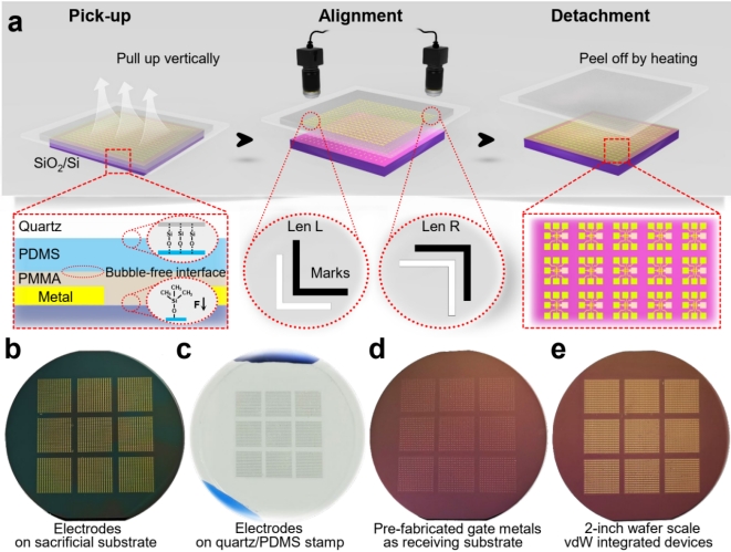 但是,只有几个原子层厚的二维半导体具有十分敏感的晶格结构,使得其在器件制备过程中很容易受到损伤。随机出现的缺陷会导致器件性能不均匀,阻碍了二维半导体器件的规模化制备和应用。近年来逐步发展出的一种新型的范德华异质集成技术,可以将金属电极制备到牺牲基底上,再用范德华作用力将电极拾取后转移组装到二维材料表面,从而避免了与二维材料的直接集成,可以获得无界面损伤的范德华接触二维电子器件。然而,目前范德华集成技术无法同时满足大面积转移和高精度对准的需求,使得大面积范德华集成二维电子器件的制备仍然面临巨大挑战。