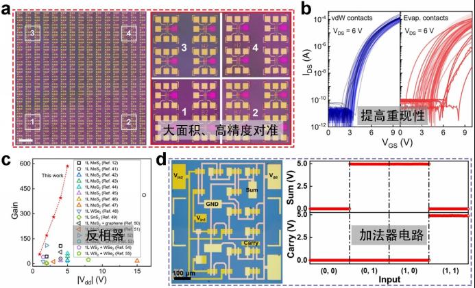该研究开发的大面积范德华集成技术还引入了接触式光刻的对准技术,可以进行大面积、高精度批量对准,对准误差只有几微米。基于这一技术,该研究可以基于相同的单层MoS2材料进行大面积范德华接触二维晶体管与传统蒸镀接触晶体管性能的统计对比研究,证实范德华接触避免了传统器件制备工艺中引入的不可控的损伤,不仅具有多方面更好的晶体管性能指标,还具有高均匀性和重现性。进一步用于制备范德华集成MoS2反相器和逻辑电路,分别展现出高的增益和低的逻辑运算电压损耗。这些结果表明这种大面积范德华集成技术具有一定的实用价值,有利于推动二维材料与半导体工业的融合。