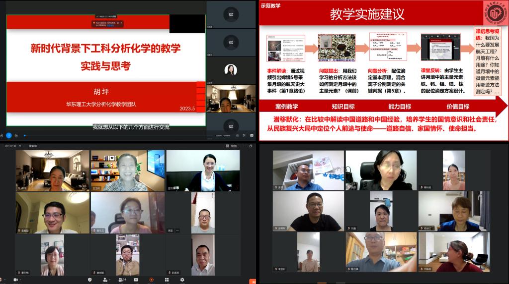 分析化学课程教学情况和课程发展历程,随后就工科分析化学的教学提出总体思想,以实例介绍如何在分析化学教学实践中开展启发式、案例式和活动式教学,来激发学生的兴趣、思维和活力。之后,胡老师以月壤中五种主量金属离子的含量测定为例,介绍了如何在绪论、课前、课中、课后开展课程思政教学设计与实施,以嫦娥五号采集月壤的航天事件为绪论部分的切入点,课前提出如何用学习的化学分析方法测定月壤主量元素的问题,结合配位滴定原理和混合金属离子分别测定的判据对问题进行分析,课堂中由学生主讲配位滴定方案设计,在潜移默化中培养学生的国情意识和社会责任,实现案例教学、知识、能力、价值目标的达成。最后,胡老师总结了新时代面向工科人才培养的课程建设经验。报告后,与会老师在线上与胡老师进行了热烈的讨论。