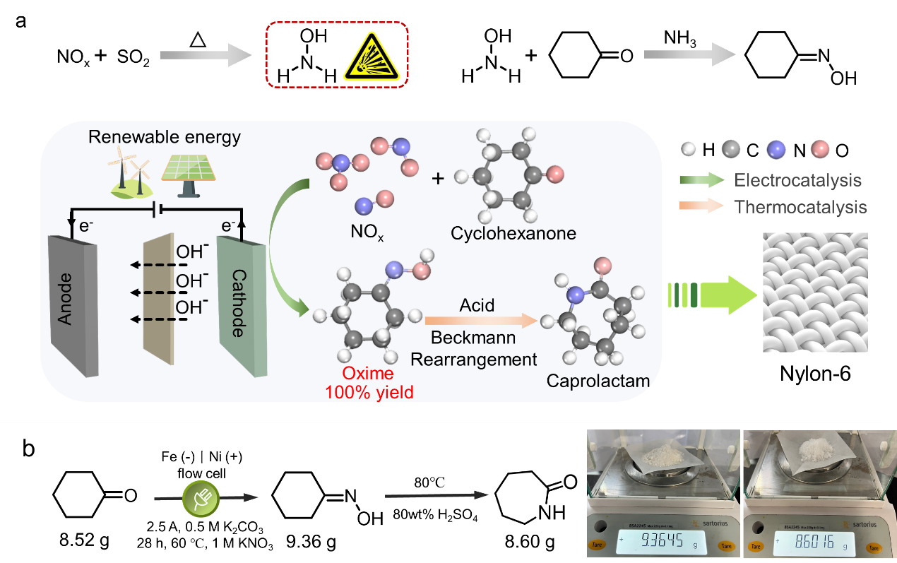 王双印教授团队提出了一种使用氮氧化物和环己酮直接电合成环己酮肟的方法,收率接近100%,避免了使用高浓度羟胺溶液,展示了一种简单的绿色生产尼龙6前驱体的策略。