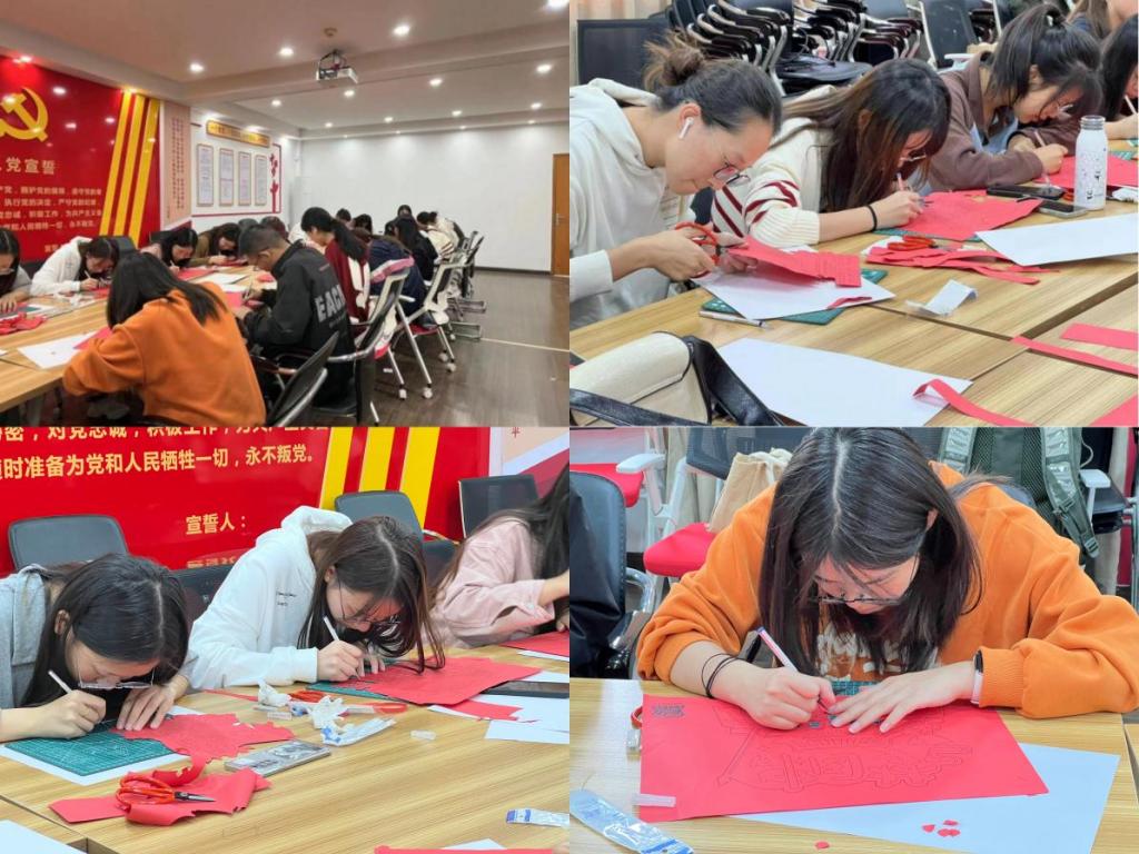 下午三点,参与剪纸活动的同学们在新化工楼D区党员活动室集合,大家有序地领取剪刀卡纸,耐心地描绘剪出一幅幅生动的剪纸作品。通过剪纸这种易于操作且具有传统文化特色的手工艺,加深同学们对于中国传统美育的理解和认知。红色剪纸不仅是中国传统文化中喜庆的元素,也包含着革命斗争和党建工作历史,既是传统艺术的植入,更是党员理想信念的植入。