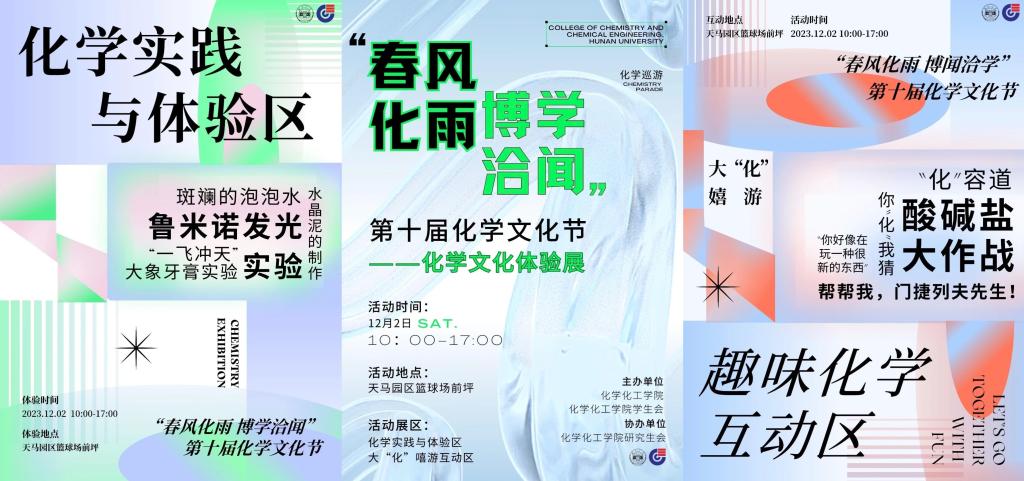 学生会主办、研究生会协办的“春风化雨,博学洽闻”第十届化学文化节于天马园区篮球场举办。本次活动集动手实验沉浸体验、趣味化学知识游戏互动、科普宣讲于一体,旨在展现湖大化院文化底蕴和化院学子的青春风貌,为湖大师生搭建跨学科交流的平台,营造浓厚学风氛围进园区。
