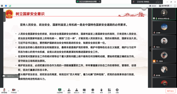 本科应化党支部开展主题为“守卫国家安全,全体公民有责”的党日活动。活动以线上腾讯会议形式召开,活动强调了进行国家安全教育的必要性,并呼吁全体同志做好模范带头作用,树立国家安全意识要从小事做起,从自我做起,从现在做起,主动履行职责,保护国家安全不只是政府的责任,也是所有公民包括全体党员在内的神圣责任与义务。