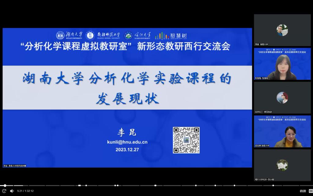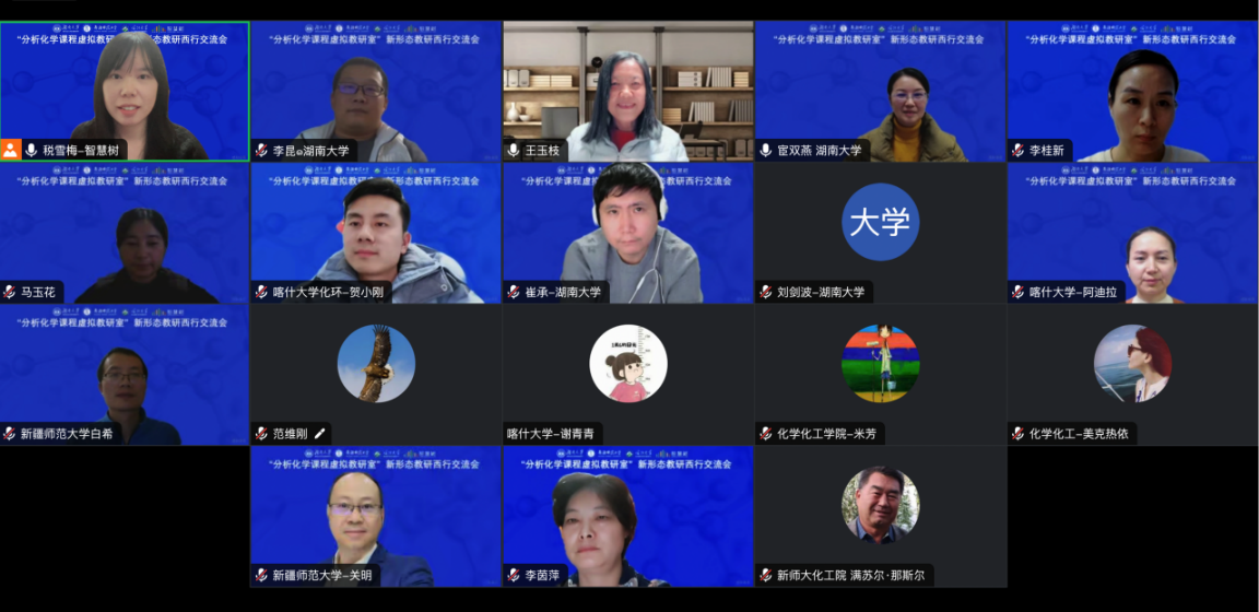 为持续推进“慕课西部行计划”2.0行动,探索新形态《分析化学实验》的教研与教学形式,12月27日,湖南大学、新疆师范大学和喀什大学三校分析化学教研室教师举行了“分析化学课程虚拟教研室”《新形态教研西行(第二期)——分析化学实验课程的经验分享》教研活动。湖南大学宦双燕教授介绍了本次活动的主题和参会人员的情况,三校教师代表分别报告了本校分析化学实验课程的开设情况和发展现状,全体虚拟教研室成员针对当前的现状和遇到的问题进行了交流。本次会议在智慧树组织的虚拟教研室平台上开展,由智慧树西行办税雪梅主持。