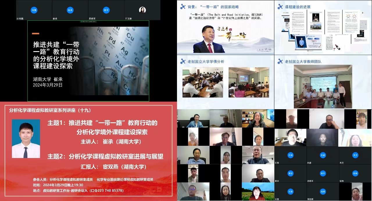 2024年3月29日,分析化学课程虚拟教研室举行了第十九期讲座,本次会议湖南大学崔承副教授为主讲嘉宾,他的报告题目是:推进共建“一带一路”教育行动的分析化学境外课程建设探索,随后宦双燕教授汇报了分析化学课程虚拟教研室进展与展望,来自分析化学课程虚拟教研室和化学类专业基础理论课程虚拟教研室的76位教师参加了本次线上会议。