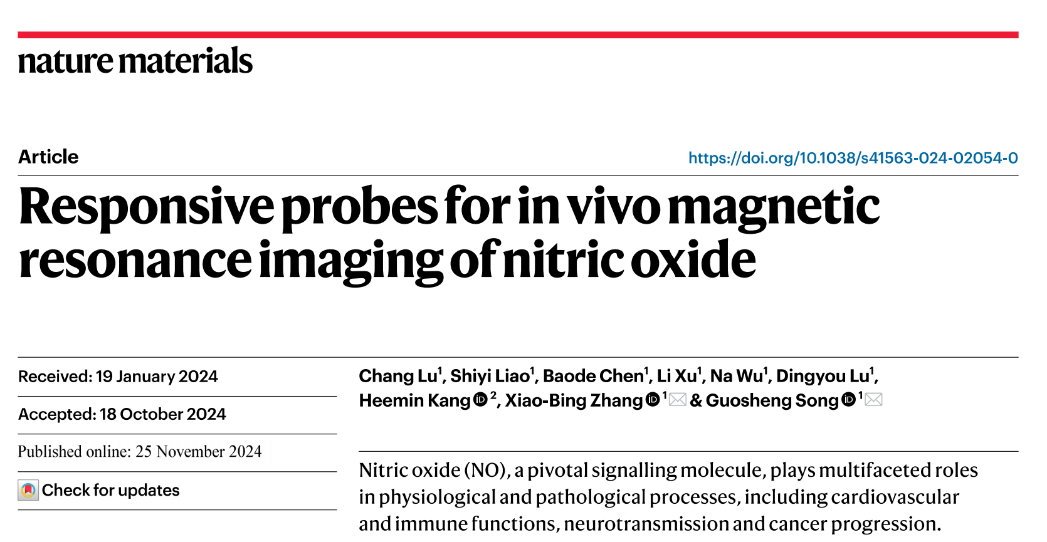 相关研究成果以《Responsive probes for in vivo magnetic resonance imaging of nitric oxide》为题发表在国际顶级期刊《自然-材料》《Nature Materials》。文章的通讯作者是湖南大学宋国胜教授和张晓兵教授。第一作者是陆畅博士(湖南大学博士后)。