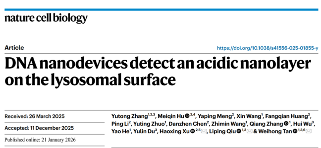 该研究充分体现了化学工具驱动生物学新发现的交叉学科潜力,为探索细胞器表面微环境及其生理功能开辟了全新的研究方向。相关成果2026年1月以“DNA nanodevices detect an acidic nanolayer on the lysosomal surface”为题发表于Nature Cell Biology。抢庄牛牛官方网站