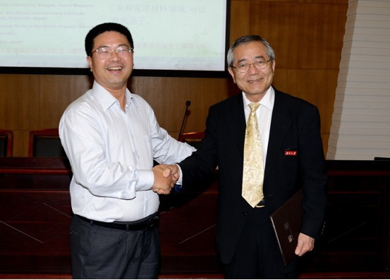 院长蒋健晖主持,全校近300名师生参加。副校长曹一家教授为根岸英一教授颁发湖南大学名誉教授证书并配带校徽,