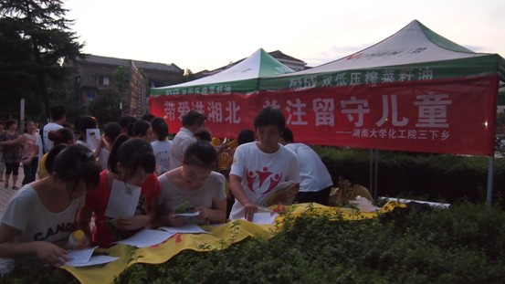 暑期三下乡社会实践团队在汉寿县城休闲广场向过往的居民分发以关注留守儿童为主题的爱心书签和宣传单,并为居民们耐心讲解本次活动的目的与意义,并邀请居民在本次活动的爱心横幅"带爱进湘北,关注留守儿童"上签下姓名给予留守儿童一份爱心关注。同时三下乡队员邀请汉寿县居民填写一份关于食品安全的调查报告,在关注留守儿童的同时关心儿童的食品安全,关心自身的食品安全,关心社会的食品安全现状。居民们就各自对食品安全的看法发表了自己的见解,大家的积极讨论使得让三下乡队员们深刻认识到了居民们对食品安全的关心程度和渴望社会能营造一个让人们放心吃放心喝的大环境的心愿,每一位填写了调查报告并签名横幅的居民都免费领取了一瓶由盈成公司赞助的健康双底菜籽油一瓶。