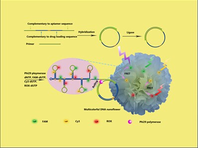 靶向药物指的是在细胞分子水平上能够识别肿瘤组织,从而使肿瘤细胞特异性死亡,而不会波及其他正常细胞的智能型药物,因此靶向药物又称为“生物导弹”。该课题组通过将小分子药物修饰到核酸适配体上,开发了一种用于靶向治疗的核酸适配体-抗癌药加合物。该系统的靶向治疗效果已在老鼠活体试验中得到了很好的验证(NPG Asia Materials, 2014, Just accepted)。为了进一步实现核酸适配体-抗癌药加合物的自动化和模块化制备,课题组设计和提出了一种通用的合成方法,在DNA/RNA合成仪上实现了核酸适配体-抗癌药加成物的自动化合成(J. Am. Chem. Soc., 2014, 136, 2731)。除此之外,基于滚坏扩增反应,课题组还提出了一种简易的方法用于制备核酸适配体共轭的具有FRET(荧光能量共振转移)功能的纳米花(NFs),实现了靶细胞的多元成像和靶向药物的追踪输送,该工作发表在Angew. Chem. Int. Ed.上,并被选为热点论文(Angew. Chem. Int. Ed., 2014, 53, 5821)。他们还利用DNA核酸适配体特定的构象转换性质和支点诱导的链置换反应,设计了DNA纳米爪,实现了对多个癌细胞表面标记物的逻辑检测、智能诊断和靶向光动力学治疗(J. Am. Chem. Soc., 2014, 136, 1256)。