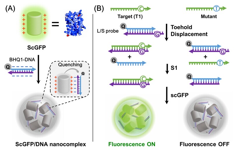 发展新型分子工具对于生命分析化学具有重要意义。超电荷荧光蛋白是经过蛋白质工程表面重组得到的一种新型荧光蛋白,其具有高稳定性、极佳的细胞穿透性以及优良的生物大分子载体性质。聂舟教授课题组首次利用这种新型蛋白分子工具构建通用化核酸传感信号单元,结合Toehold核酸探针和单链核酸酶特异性识别,发展了一种具有高特异性的DNA点突变检测方法,该方法具有极低的荧光背景,检测简单快速,能够高特异性的区分单碱基突变等优点。并进一步将该方法与亚硫酸氢盐处理和核酸级联扩增相结合,发展了一种特定基因位点甲基化程度的高灵敏荧光分析方法,并用于结肠癌病人的实际癌症组织样本分析,实现了结肠组织样品p16基因位点甲基化程度的定量检测,所得结果与甲基化测序结果一致,证明了该方法具有用于DNA甲基化临床诊断的可能性。该论文被Angew. Chem. Int. Ed.杂志甄选为热点文章(hot paper)。