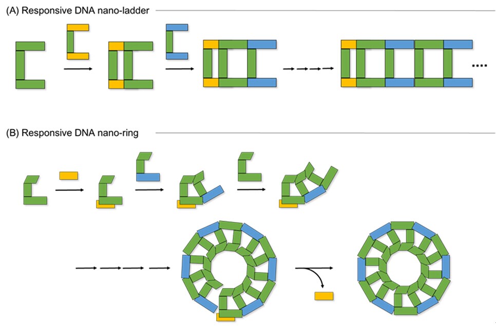 此外,聂舟教授课题组还在DNA纳米结构自组装领域开展了相关工作。DNA纳米结构是一新兴的纳米结构构建方式,具有组装高度可控,可编码及可寻址特征,以及易于功能化等诸多优点。常规DNA结构组装方法存在需要长时间变温退火过程且无法进行动态调控的不足。聂舟教授课题组与美国Purdue大学化学系Chengde Mao教授深入合作,采用仿生策略模拟细胞内微管自组装过程,率先开展了等温响应型动态DNA纳米结构组装。通过合理化设计DNA单体结构,使得不同的自组装过程,例如杂交链式反应与T连接,在有外源引发条件下实现同步连续组装,形成DNA纳米梯子及DNA纳米环等复杂二维结构。由于该DNA纳米组装过程是在常温下进行的智能响应过程,克服了传统DNA纳米结构组装方法所存在的不足,为进一步实现仿生DNA纳米组装具有重要意义(Angew. Chem. Int. Ed.2014, 53, 8402-8405)。