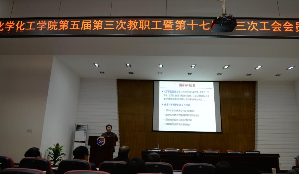 于2018年1月10下午在化工院D区大会议室举行了申报动员大会,副院长尹双凤教授向全体教职工作动员报告。尹院长先回顾了本院2017年取得的科研成就,盘点分析了本院教师在过去三年申报与被资助的科研项目以及获得的奖励荣誉,也指出抢庄牛牛官方网站